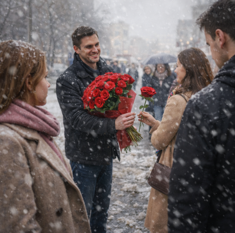 Высокий незнакомец стоял на тротуаре с огромным букетом алых роз. Он улыбался женщинам, проходящим мимо. Мужчина останавливал их, говорил тёплые слова и вручал по цветку.