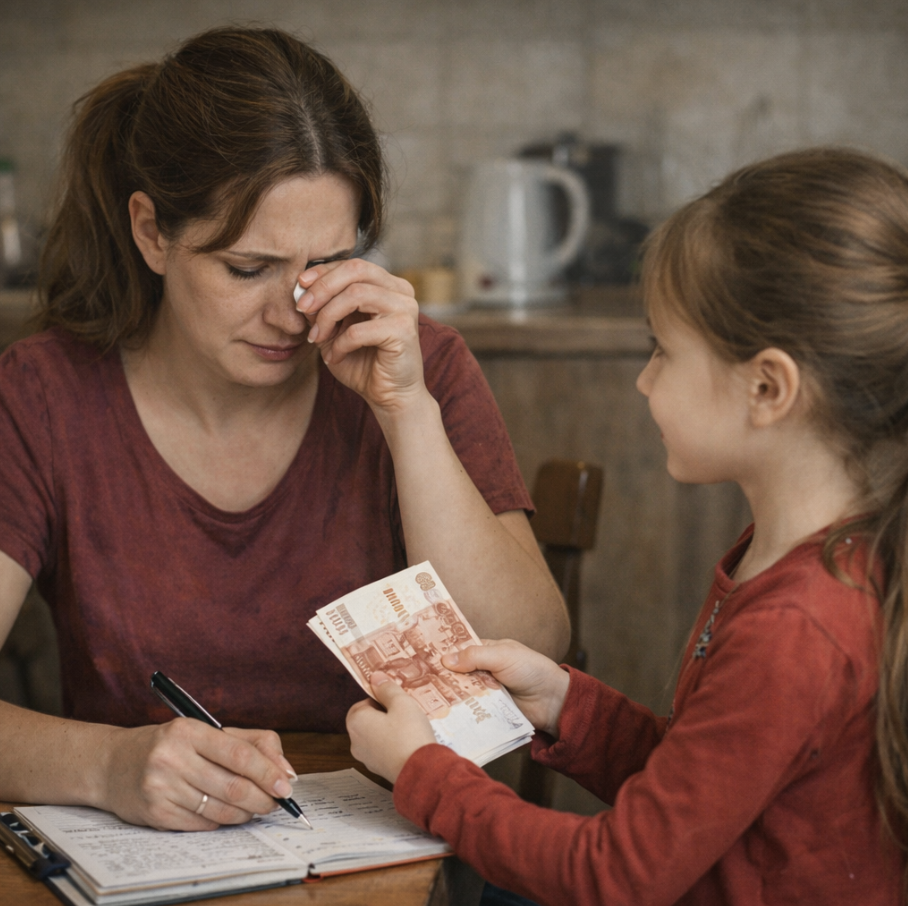 — Это из-за денег, да? Я слышала, как вы с папой спорили, — сказала девочка и вдруг протянула несколько купюр. — Возьми. Может, этого хватит.