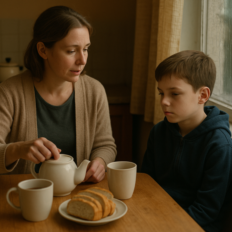 Дома Ольга поставила чайник и молча достала хлеб. Илья, не дожидаясь просьбы, нарезал ломтики и разложил по тарелкам. Кухня быстро наполнилась уютом — не от света, а от чувства, что здесь не требуют объяснений. Ольга заметила: мальчик не отводит взгляд, будто ждёт, что она скажет. Она просто улыбнулась: