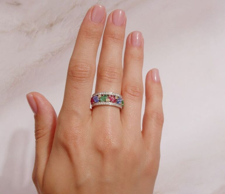 Кольца с яркими камнями — это способ рассказать, какая вы сегодня. Даже в офисе или на деловой встрече. Зачем ограничиваться только классическим золотом или серебром? Добавьте цвет! Носите кольца с камнями, как самостоятельный акцент, — в сочетании с нейтральными оттенками одежды: серым, чёрным, белым или бежевым.