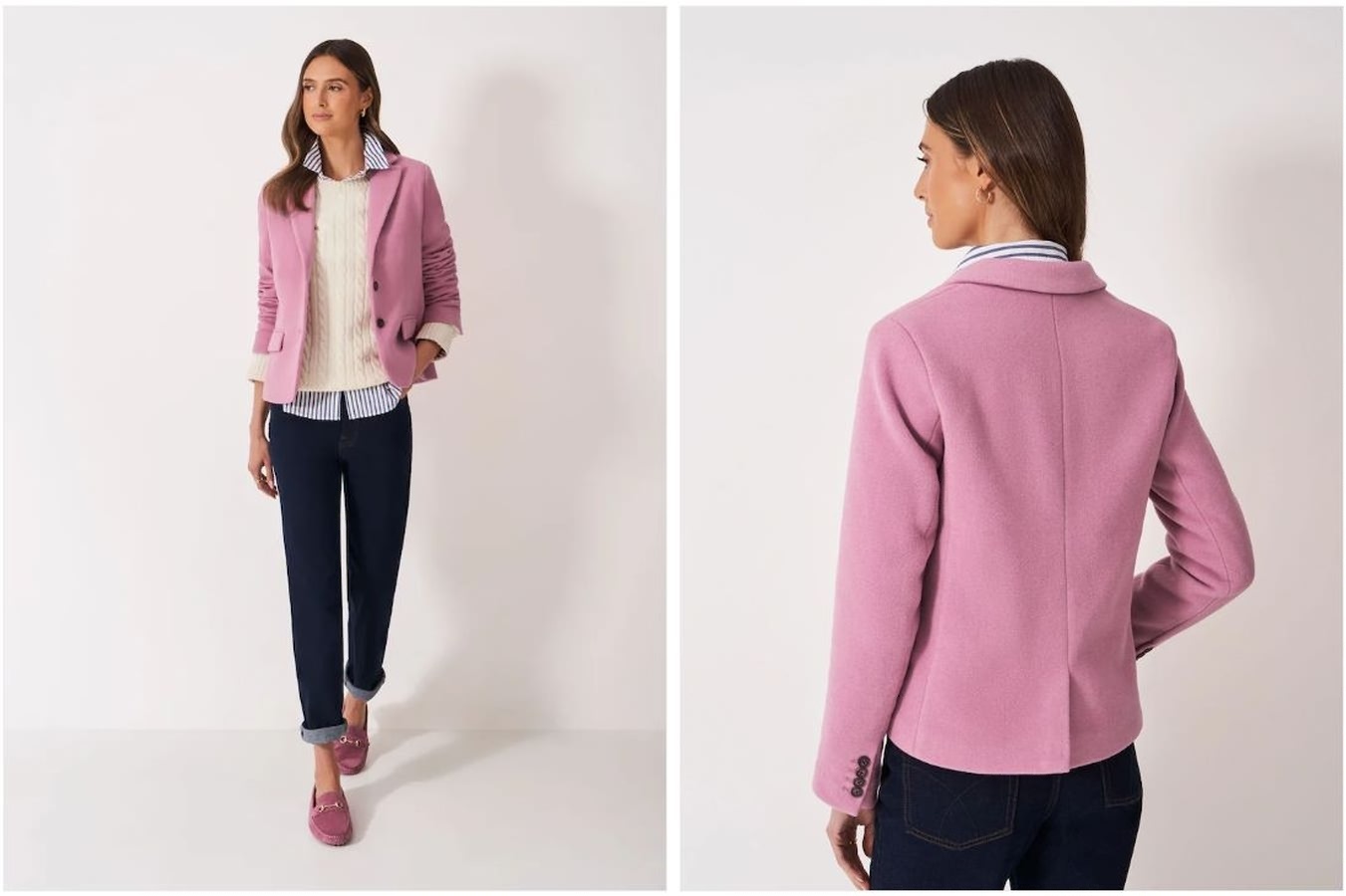 Нежно-розовый костюм освежает образ и подчеркивает благородный загар. В этом сезоне подойдут плотные трикотажные или твидовые ткани.