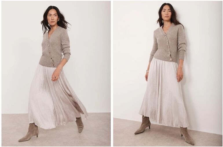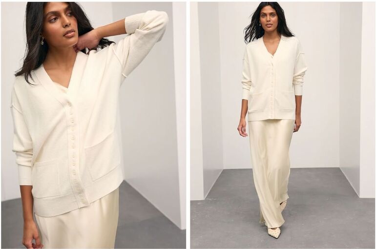 Монохромные образы всегда актуальны! Платье из трикотажа в сочетании с длинным кардиганом не только согреет в прохладный день, но и визуально удлинит фигуру.