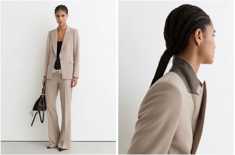 Бежевый костюм-двойка относится к вечной классике. Он отлично дополняется контрастными элементами, такими как черная майка, сумка и кожаные лоферы с золотистым декором.