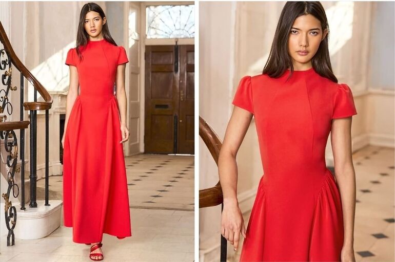 Насыщенный красный цвет можно отнести к чистым тонам. Яркое платье хорошо сочетается с белоснежной сумкой и утонченной обувью.