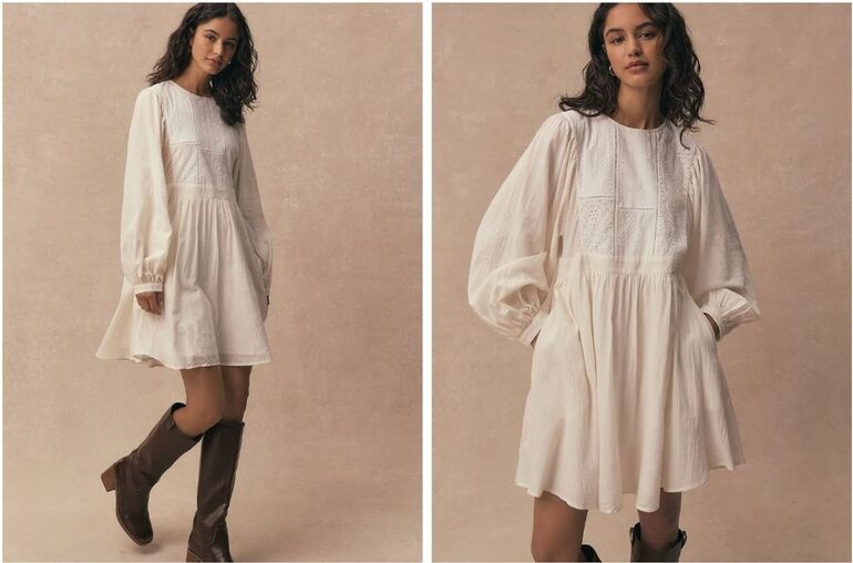 Шифоновое платье с ажурными вставками придает любому наряду женственность и привлекательность. Коричневая сумка гармонично вписывается в образ, не перегружая его.