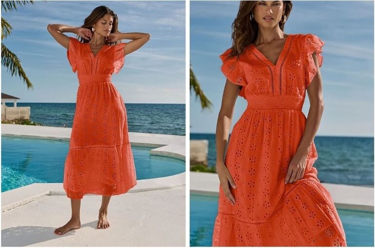 Морковное платье с кружевом легко превратить в наряд, который привлечет внимание. Шляпа и крупные украшения добавят ансамблю эффектности.