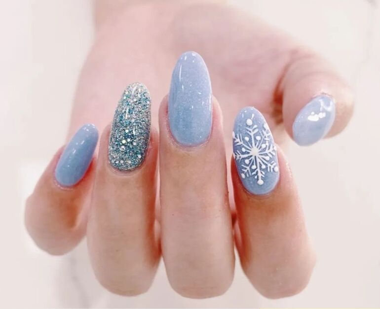 Нежный маникюр на овальные ногти получится, если соединить френч и аккуратные, минималистичные снежинки. А если по душе яркие варианты, то играйте на контрастах, создавая белые узоры на выбранном фоновом цвете.
