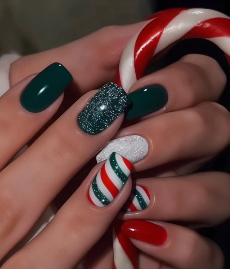 Маникюр в стиле новогоднего леденца смотрится ярко, красиво и празднично. Цвет можно подбирать любой.