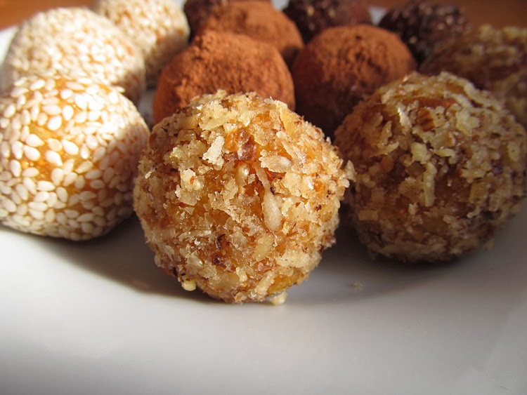 Получившиеся шарики обваливаем присыпками по вашему желанию. Я обсыпала в какао+корица+мускатный орех, в кунжуте, в тертом грецком орехе, и в тертом шоколаде.