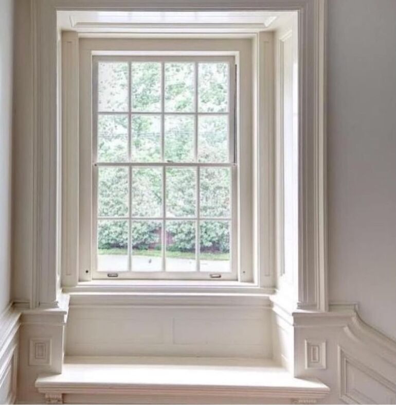 Простой и эффективный способ выделить окно — установить молдинг в форме буквы П по периметру проема. Это подходит современной классике, где не требуется много декоративных элементов.