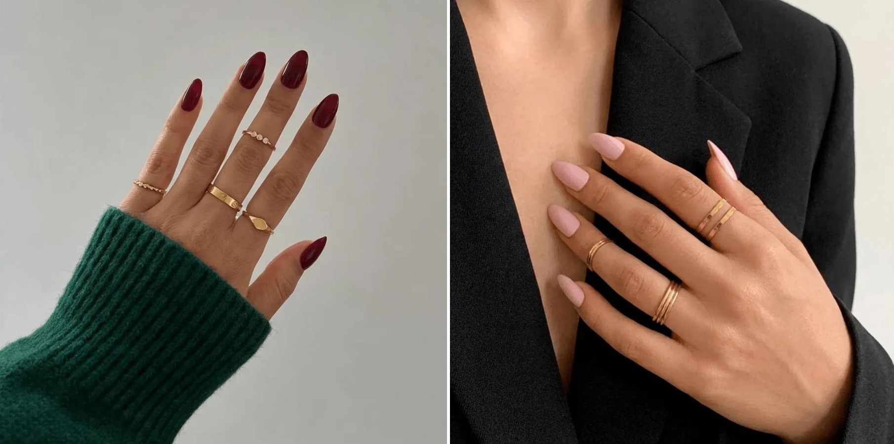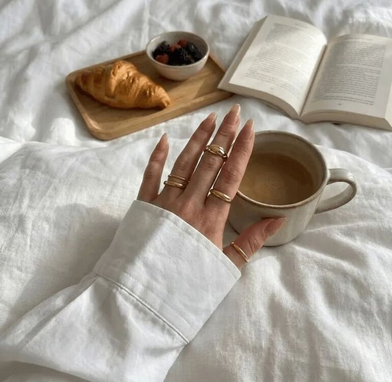Украшения важно правильно распределить. Наденьте крупное кольцо на указательный палец и дополните его двумя одинаковыми кольцами на безымянном. За счёт разной текстуры украшения не перегружают, а, наоборот, создают сбалансированную картинку.