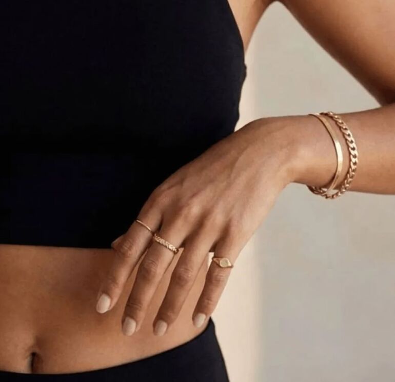 Прием такой же. Но… теперь акцентное кольцо наденьте на мизинец, а наслаивать одинаковые украшения стоит на средний палец. Такая комбинация тоже вполне уместна, выглядит аккуратно. Дополнить образ можно браслетами.