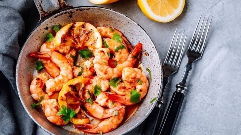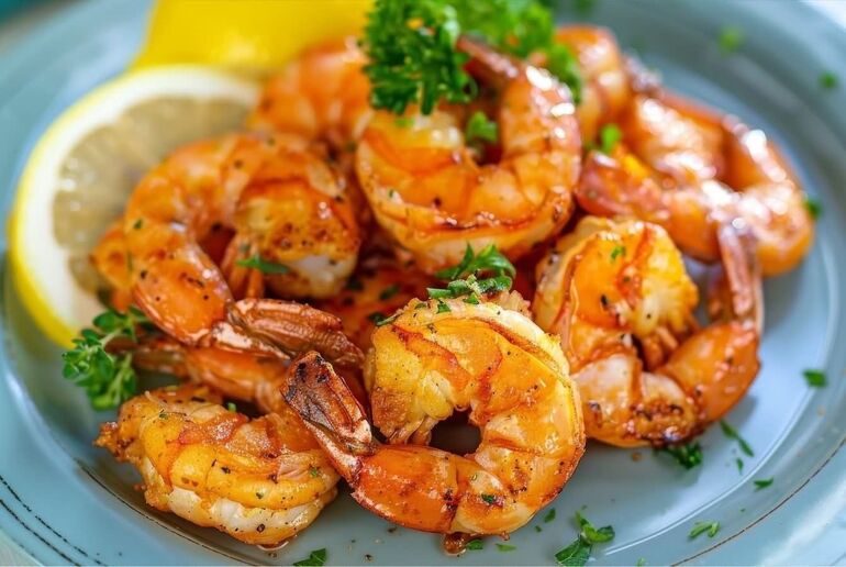 При низком содержании калорий (в 100 г — всего около 99 ккал) креветки богаты белком (24 г), а также селеном, витамином В12 и омега-3.