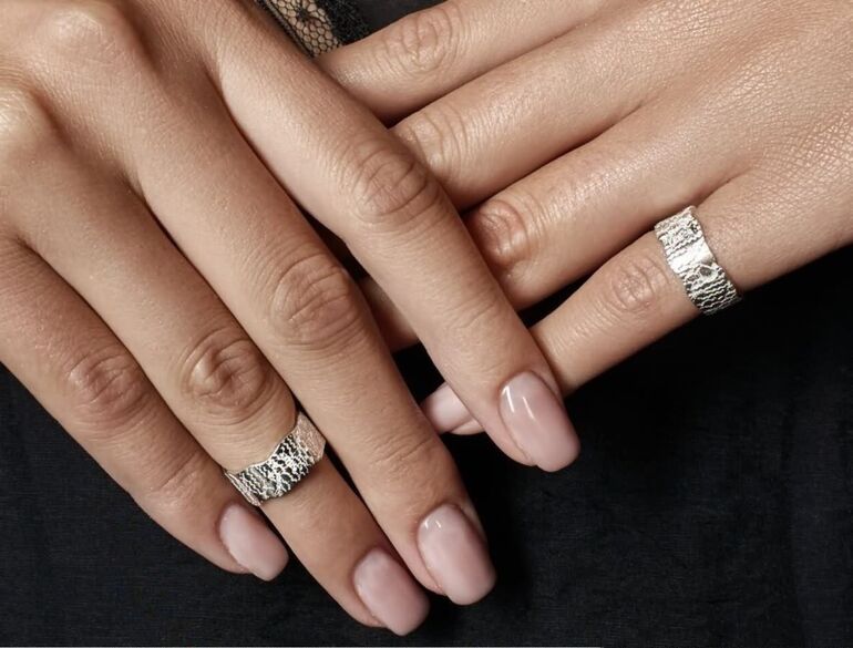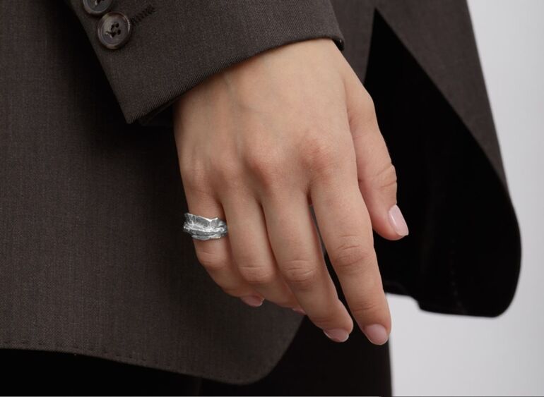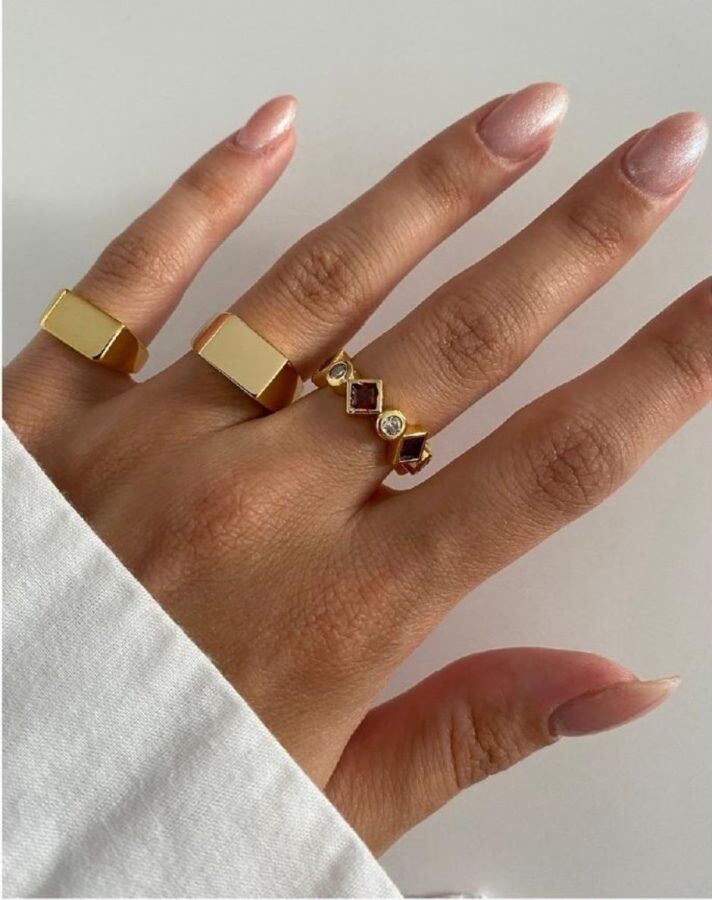 Этот минималистичный дизайн покоряет утончённостью. Вместо массивных колец — изящное миниатюрное колечко с жемчужинами, расположенное на мизинце.
