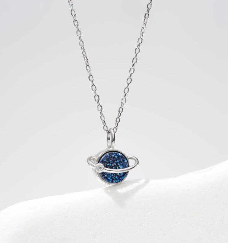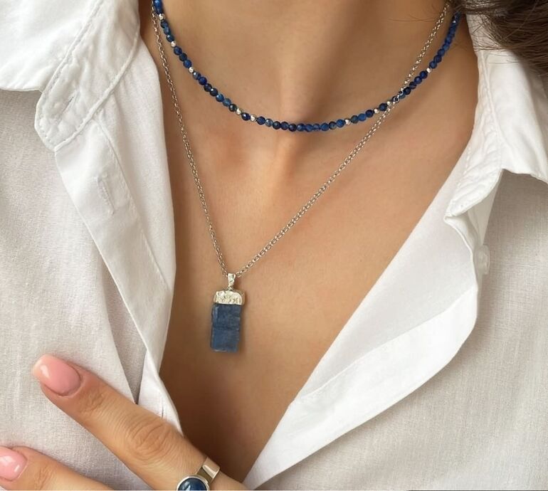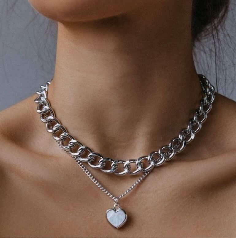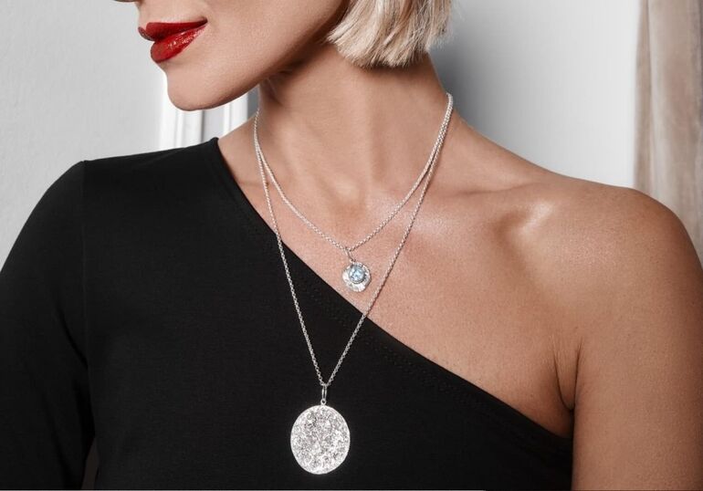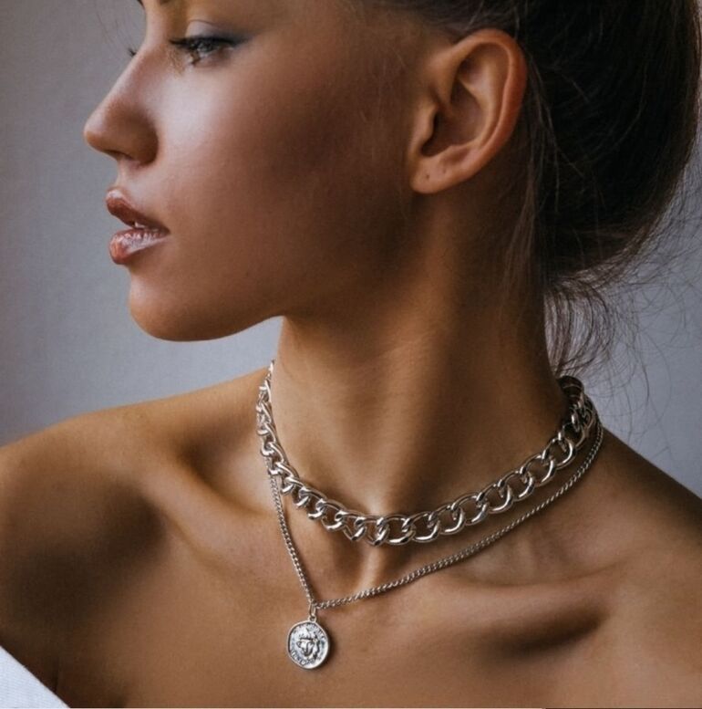 Ювелирная техника здесь на высоте: крупная подвеска уверенно держится на тонкой металлической цепочке. Парадокс в том, что цепочка почти незаметна на теле, и подвеска кажется парящей в воздухе.