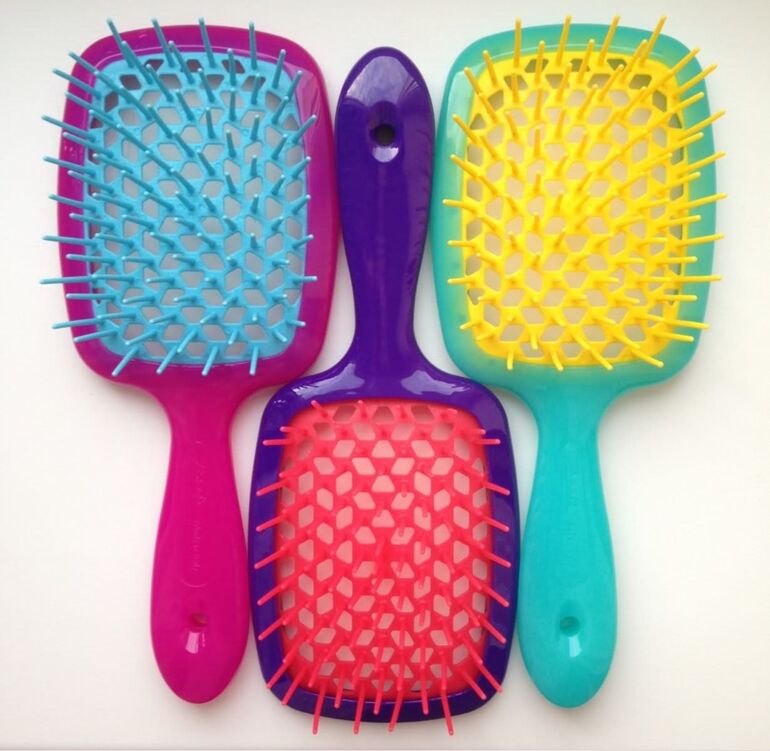 Это классическая расческа с ручкой, сделанная из приятного пластика. Щетинки средней жесткости, комфортные для кожи головы. С собой такую носить не получится, ведь она займет много места и может повредиться в сумке. Но благодаря продувной основе, это вариант для домашней укладки с феном.