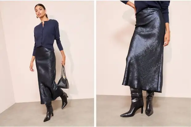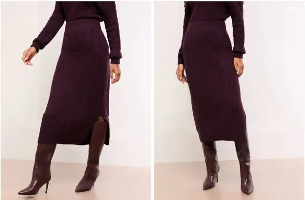 Главное – длина ниже колена, которая удачно сочетается с остроносыми и «квадратными» высокими сапогами.