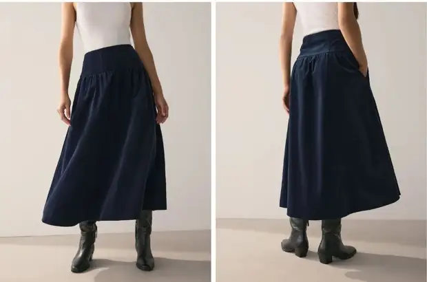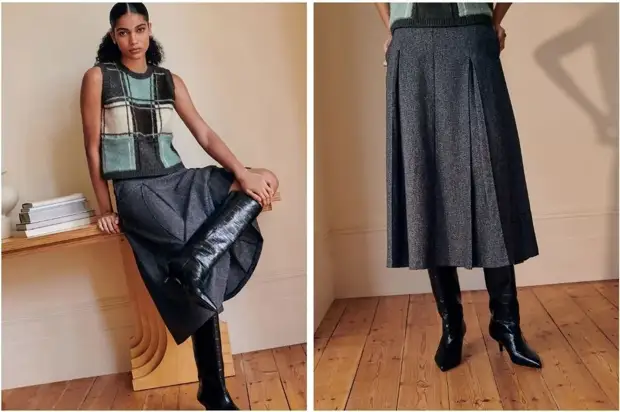 Юбка может быть из денима или вельвета, а сапоги – на небольшом каблуке или плоские, с плотно прилегающим к ногам голенищем.