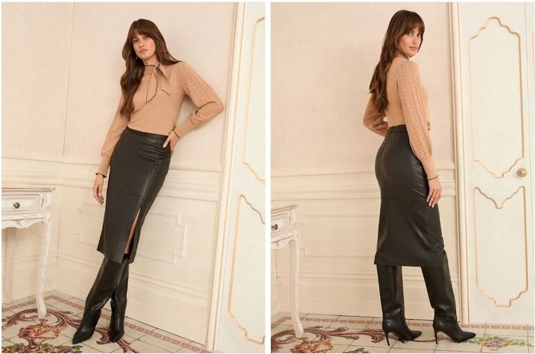 Это может быть юбка-карандаш или асимметричного кроя, с разрезом, с карманами или даже с бахромой. Главное – длина ниже колена, которая удачно сочетается с остроносыми и «квадратными» высокими сапогами.