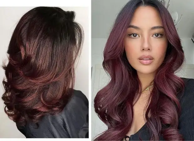 «Вишневый брюнет» — знакомый, но уже переосмысленный цвет. Теперь в его основе — глубокая шоколадная база, подсвеченная благородными винными, сливовыми или вишневыми переливами. Поэтому он получается не плоским и кричащим, как 25 лет назад, а многогранным и дорогим. Он особенно эффектен на волнистых волосах, где пряди переливаются при движении.