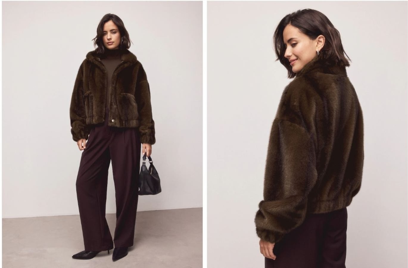 Для повседневного образа с короткой курткой возьмите за базу трикотажные брюки и свитер с высоким воротом. Они могут быть одного цвета или отличаться.