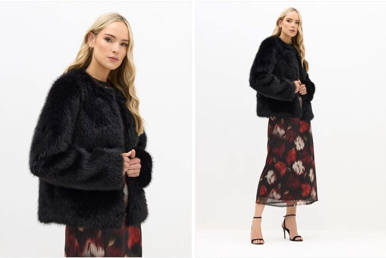 Возьмите простое однотонное платье и носите с пушистой курткой в цветочек.