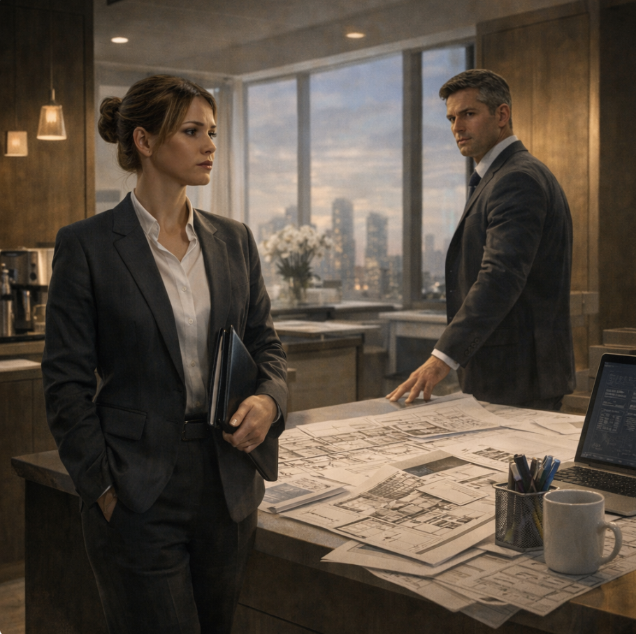 Утром кухня оказалась завалена чертежами. Дарья вышла в строгом графитовом костюме.