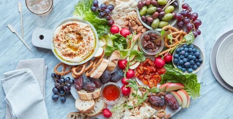 Огромные тарелки с закусками, которые все «шерят». Забудьте об индивидуальной подаче каждого салата! Красиво разложенные закуски на большой доске — это топ.