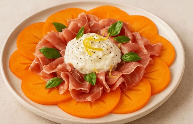КАРПАЧЧО ИЗ ХУРМЫ, ПРОШУТТО И СТРАЧАТЕЛЛЫ