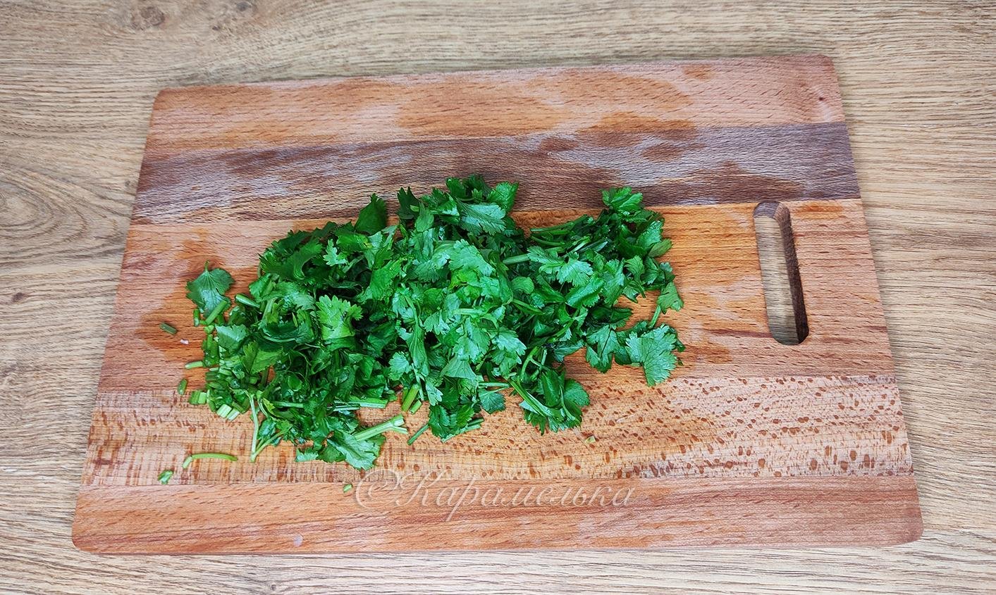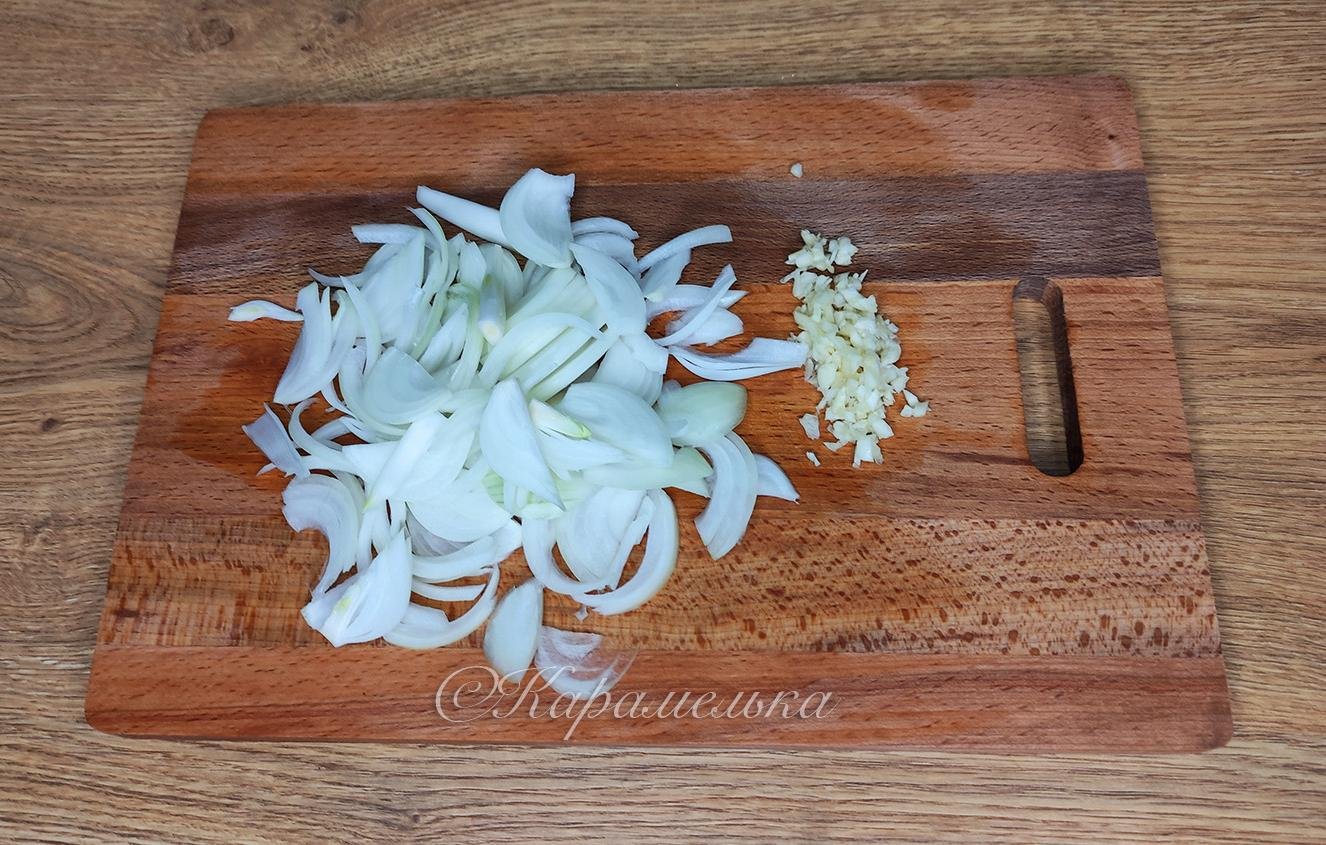 Две луковицы нарезаем перьями и измельчаем чеснок.