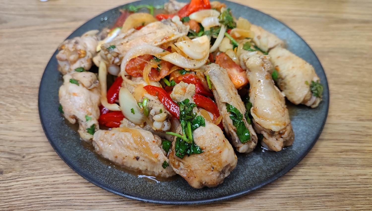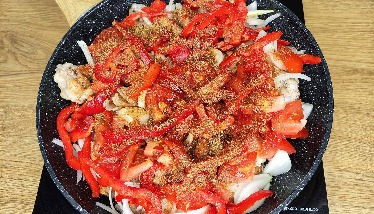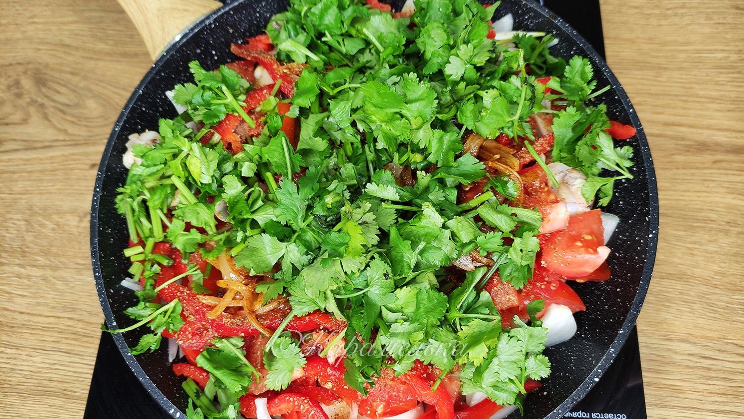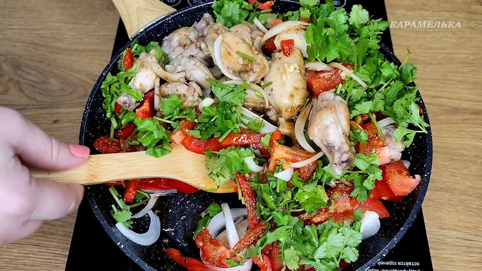 Как только крылья обжарились, добавляем две ранее измельченные луковицы, помидоры, кинзу, перец и добавляем соевый соус, уксус и сахар, хорошо перемешиваем и даем настояться 20 минут.