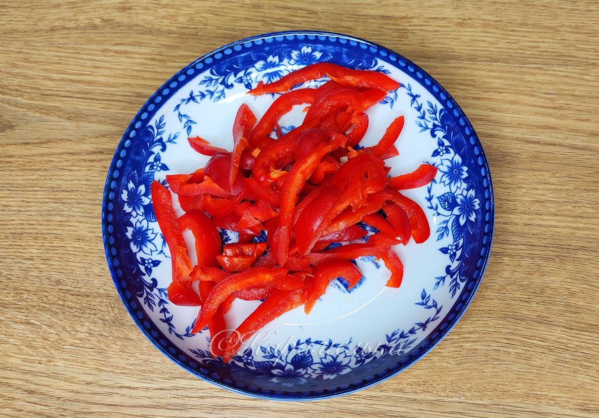 Помидор нарезаем мелким кубиком, сладкий перец соломкой.