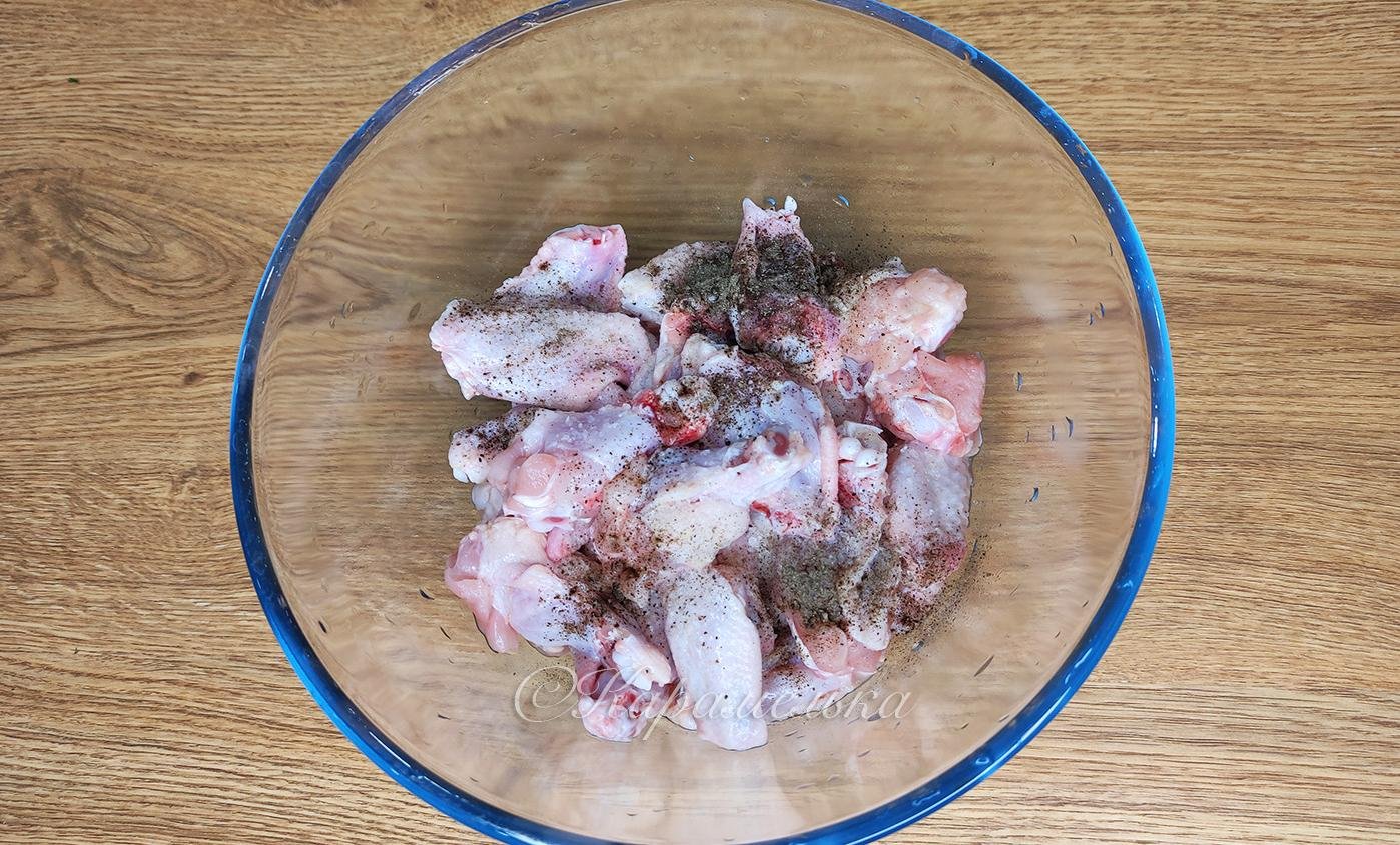 Крылья солим и добавляем черный перец, хорошо перемешиваем и убираем в сторону.