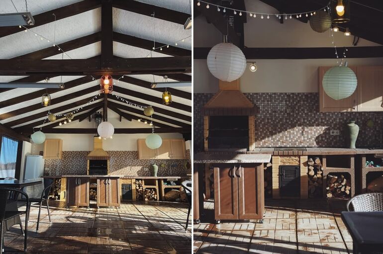 А еще у домиков есть террасы и мангальные зоны с дровами, шампурами и решетками-гриль.