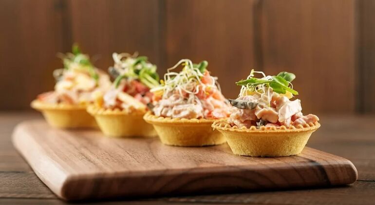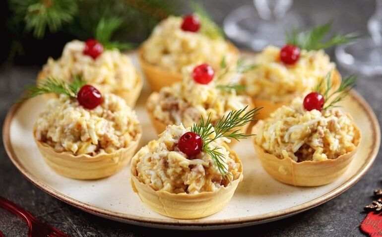 Для праздничного стола лучше выбрать песочные тарталетки, так как они дольше сохраняют свою форму и не размокают, в отличие от вафельных.