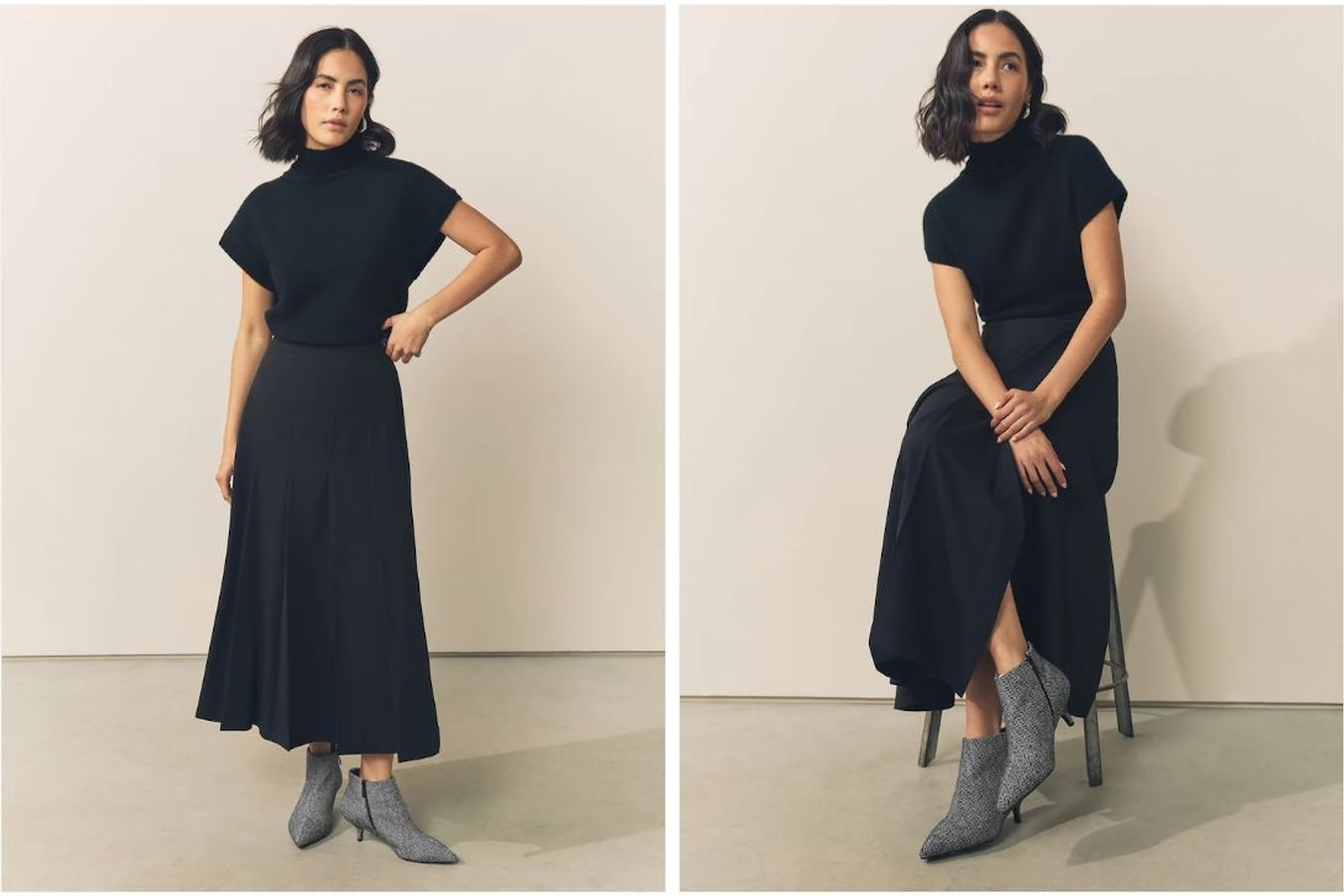 Ботильоны с удобным скульптурным каблуком высотой немного выше щиколотки носят с расклешенными миди юбками и строгими жакетами, создавая элегантный, но не слишком формальный, практичный и непринужденный образ. Также их можно носить и с простыми укороченными джинсами.