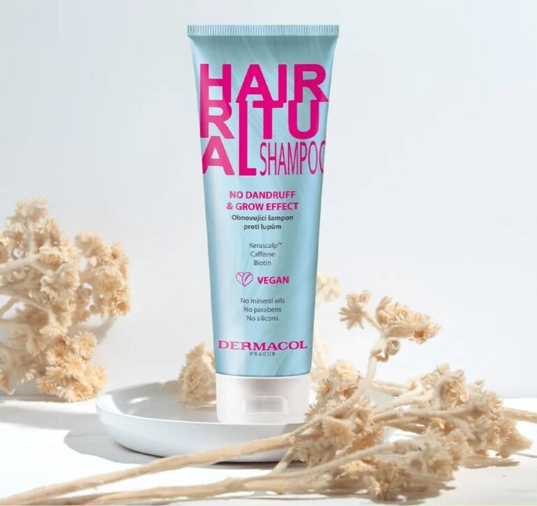 Если столкнулись не только с проблемой выпадения волос, но и с перхотью, понадобится шампунь Dermacol Hair Ritual No Dandruff & Grow Effect Shampoo. Он устраняет появление “белых хлопьев”, стимулирует волосяные фолликулы, благодаря кофеину и активному компоненту KerascalpTM, а также предотвращает выпадение, улучшает структуру локонов и увлажняет.