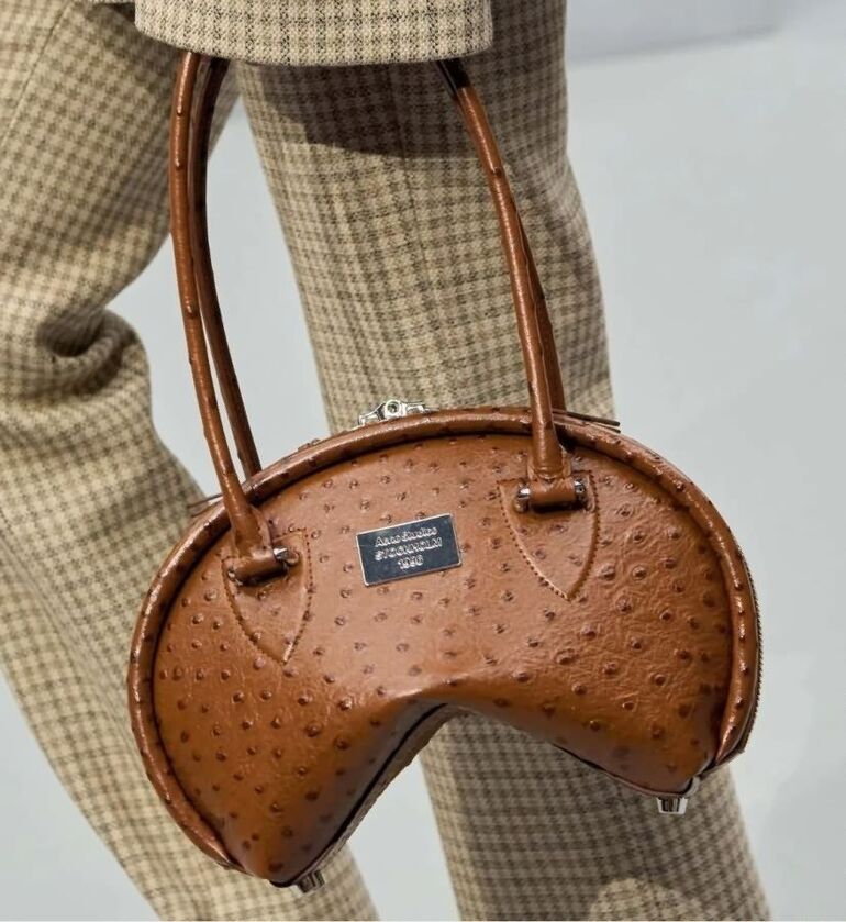 Акцентная сумка вогнутой формы, похожая на печенье, лучше подходит под это определение. Она бывает мягкой или каркасной, у нее необычный силуэт с углами вниз или вверх.