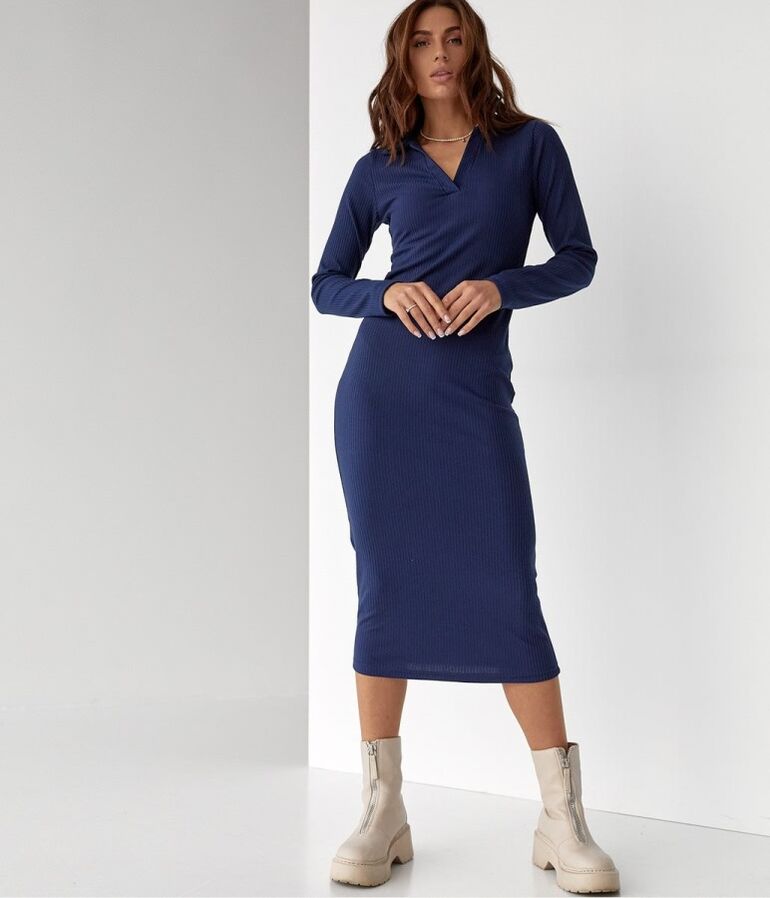 Сбоку у платья высокий разрез, а его воротник — с отворотом.