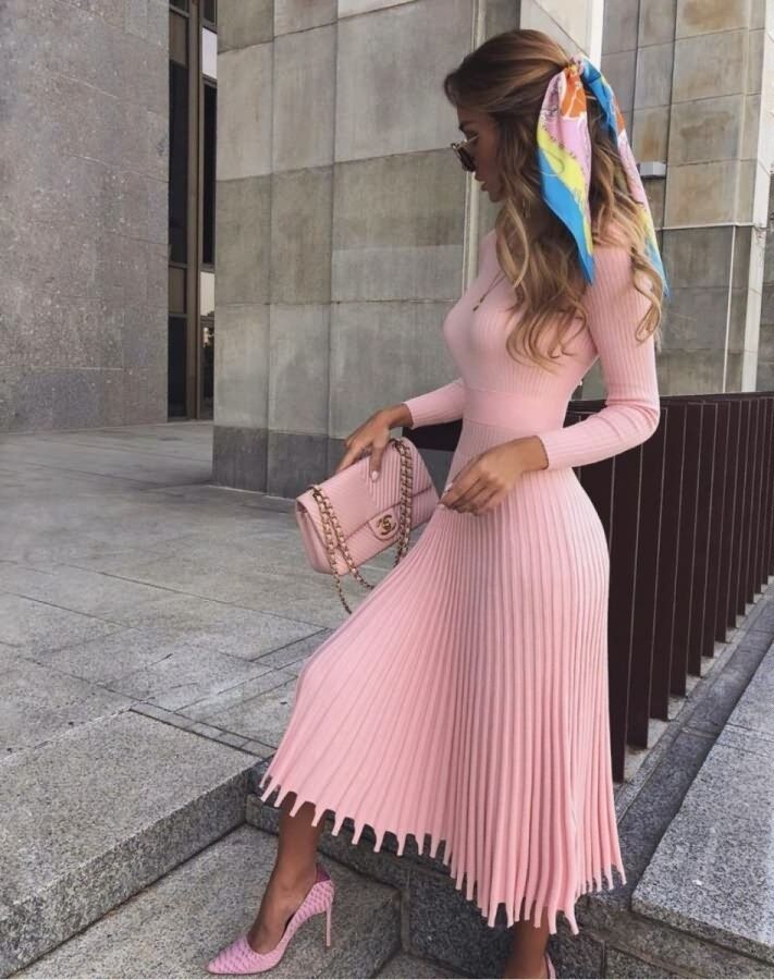 Носите платье миди с туфлями на шпильке, клатчами, объемными серьгами и массивными кольцами.