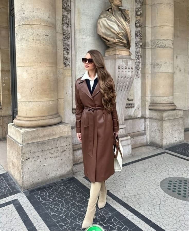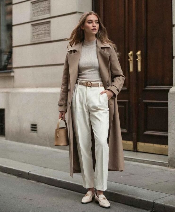Чтобы образ с этой верхней одеждой выглядел респектабельно, стоит выбирать плащи без акцентного декора и делать ставку на традиционные цвета — песочный, черный, шоколадный или серый.