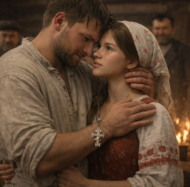 Вот и сейчас Дарья пришла навестить суженого — принесла кислого кваса, каравай, чтобы угостить работников. Увидела его — и вспыхнула, будто мак. Он сразу шагнул навстречу, обнял её бережно.