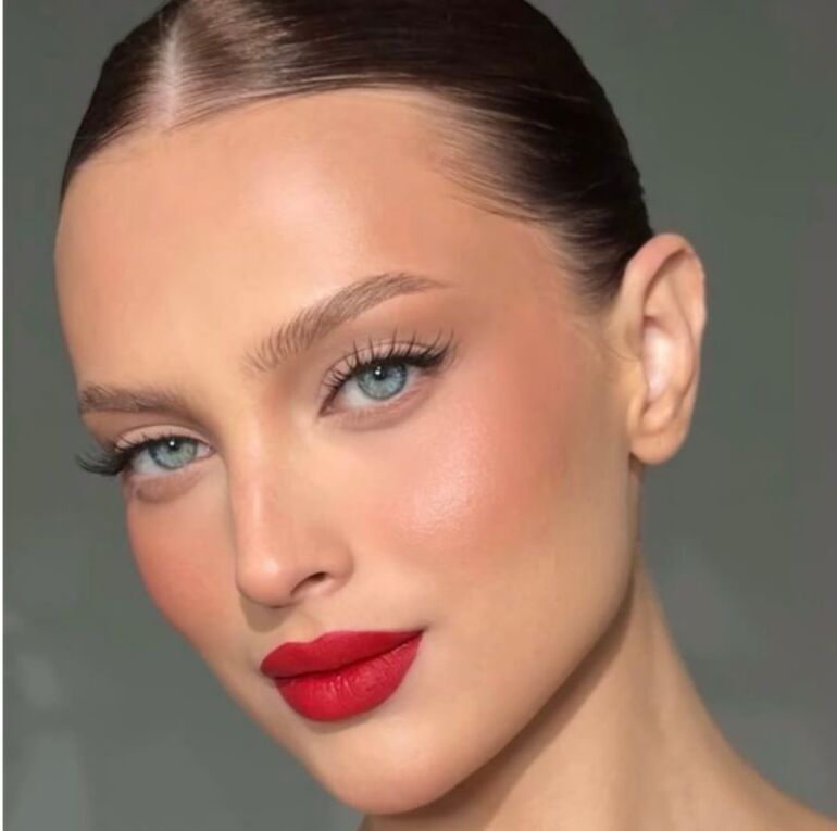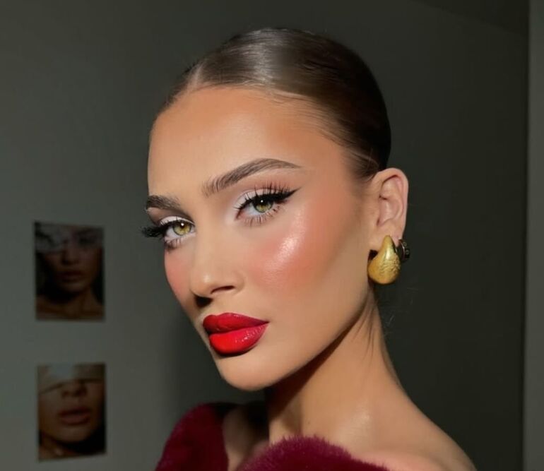 Беспроигрышный вариант на корпоратив. Плюс ко всему мейк будет в тему символа года – Красной Огненной Лошади. Помаду можно использовать любой текстуры: глянцевую, матовую, сатиновую. Главное – правильно подобрать оттенок, чтобы он был вам к лицу.