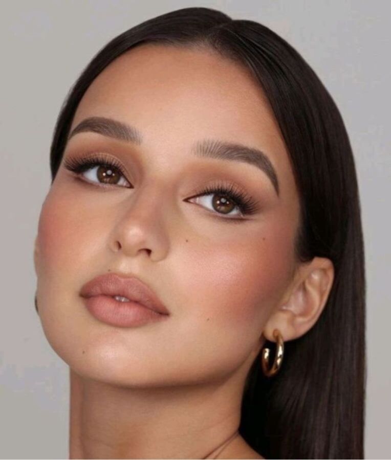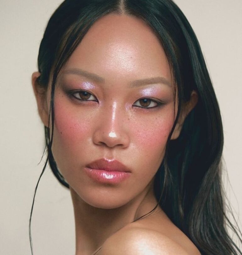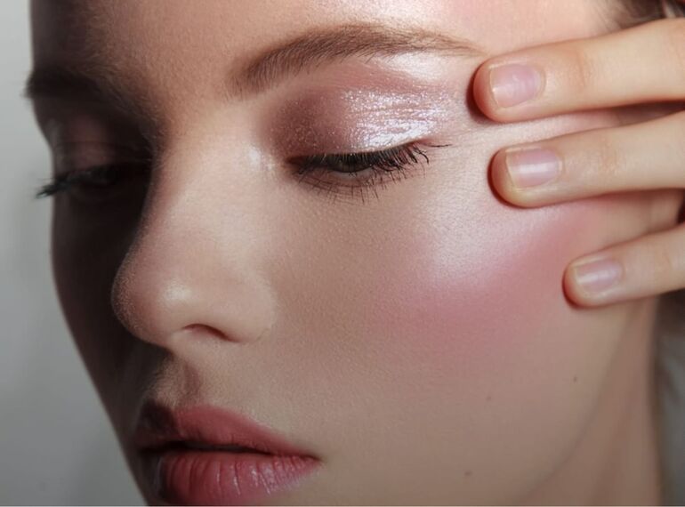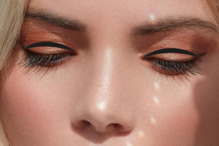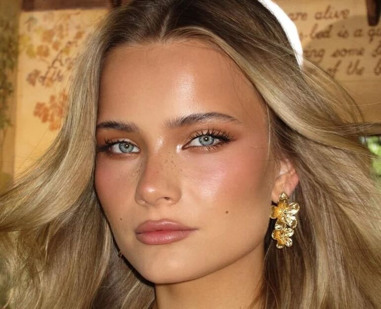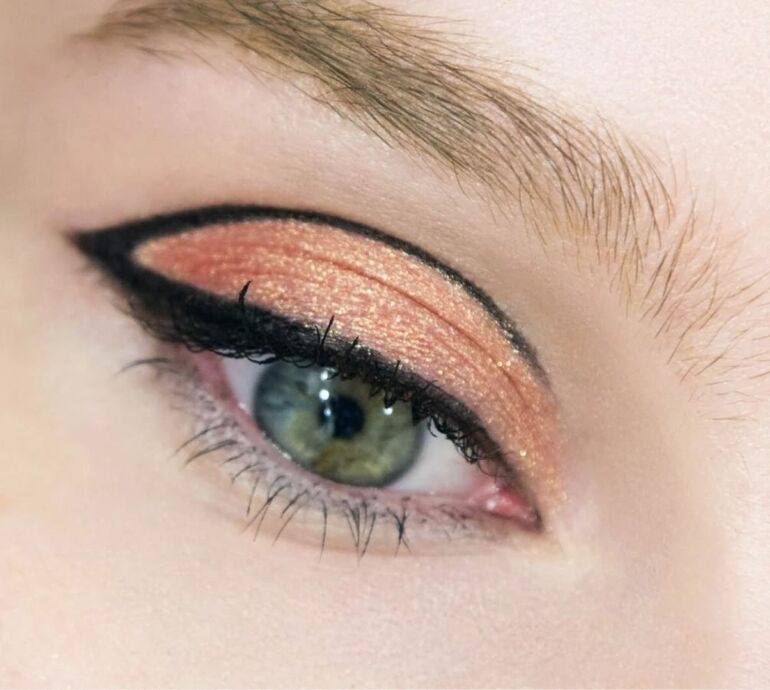 Используйте персиково-золотистый хайлайтер и румяна, чтобы создать эффект внутреннего свечения кожи. На веки нанесите тени оттенка розового золота, персика или шампань. Не забудьте прокрасить ресницы удлиняющей тушью и выделить губы полупрозрачным блеском или помадой в цвет шампанского.