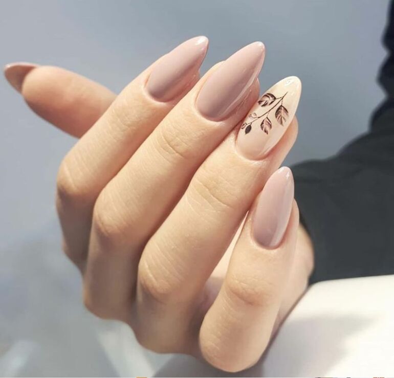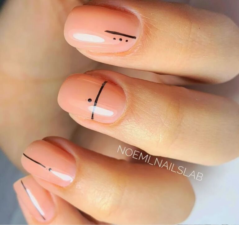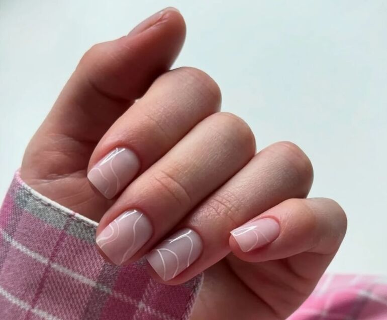 Аккуратные рисунки на нюдовом фоне — еще один вариант маникюра, который будет радовать вас долго.