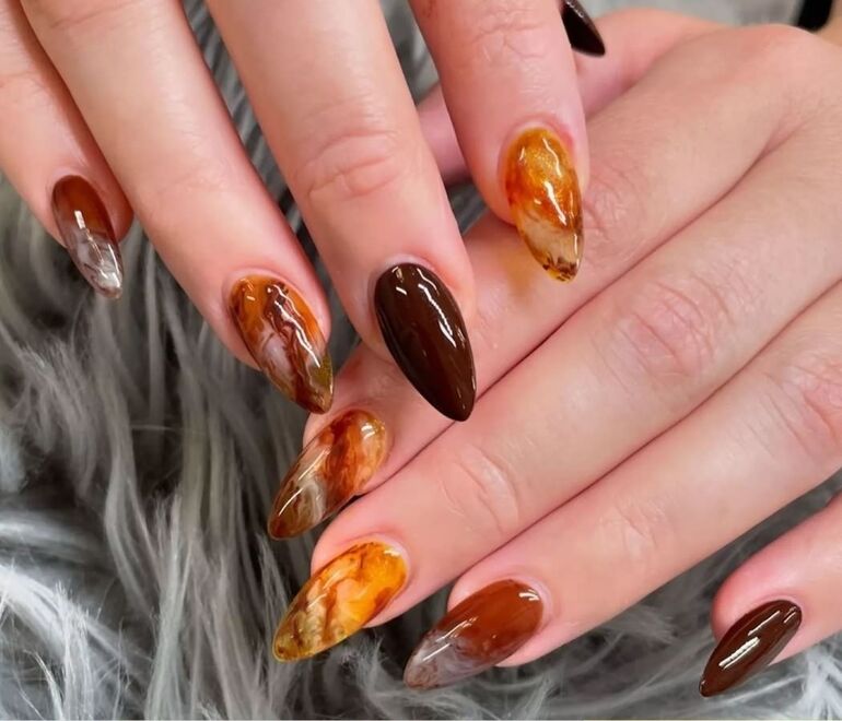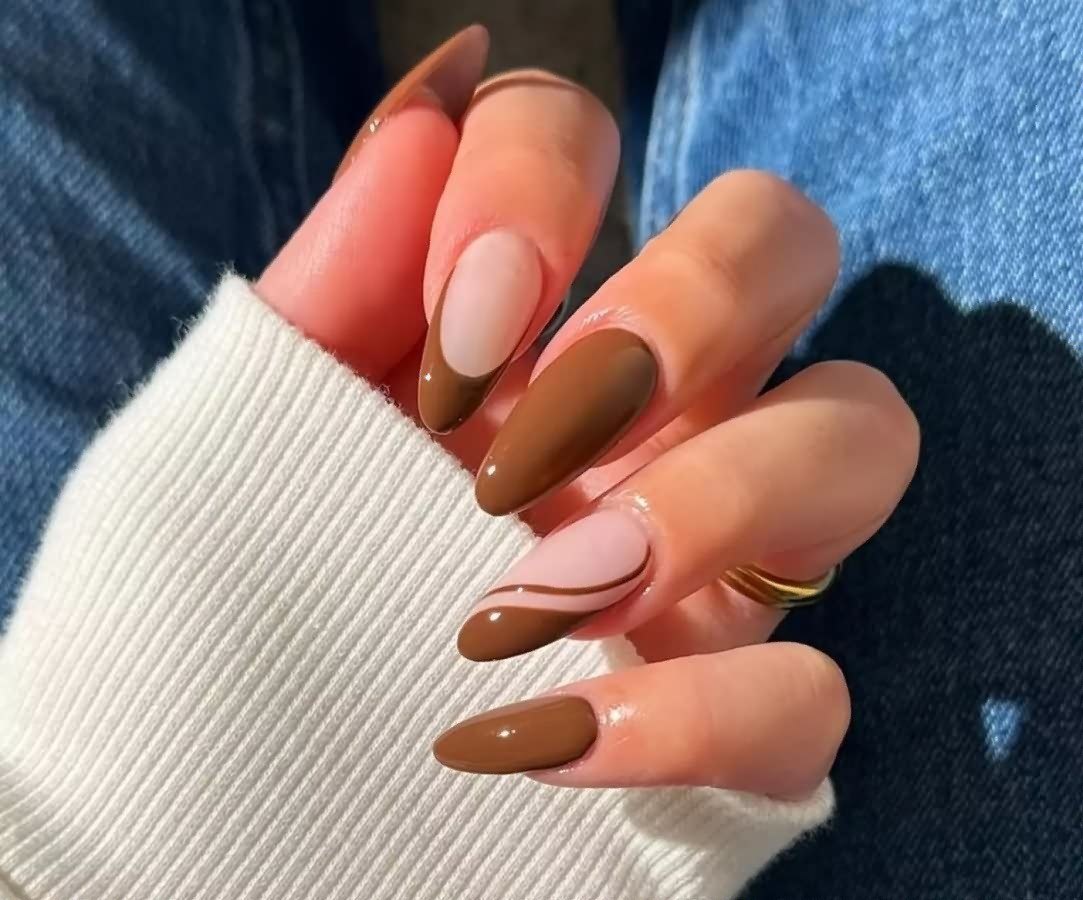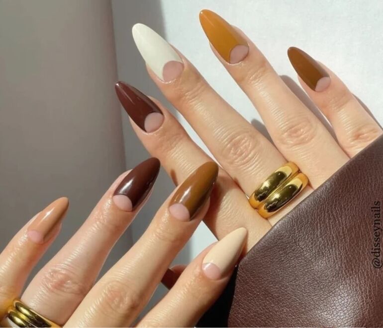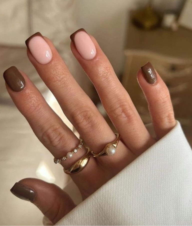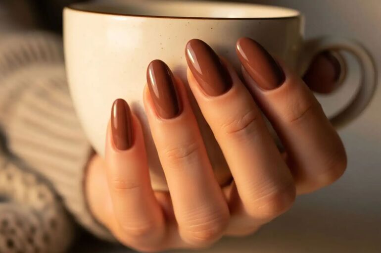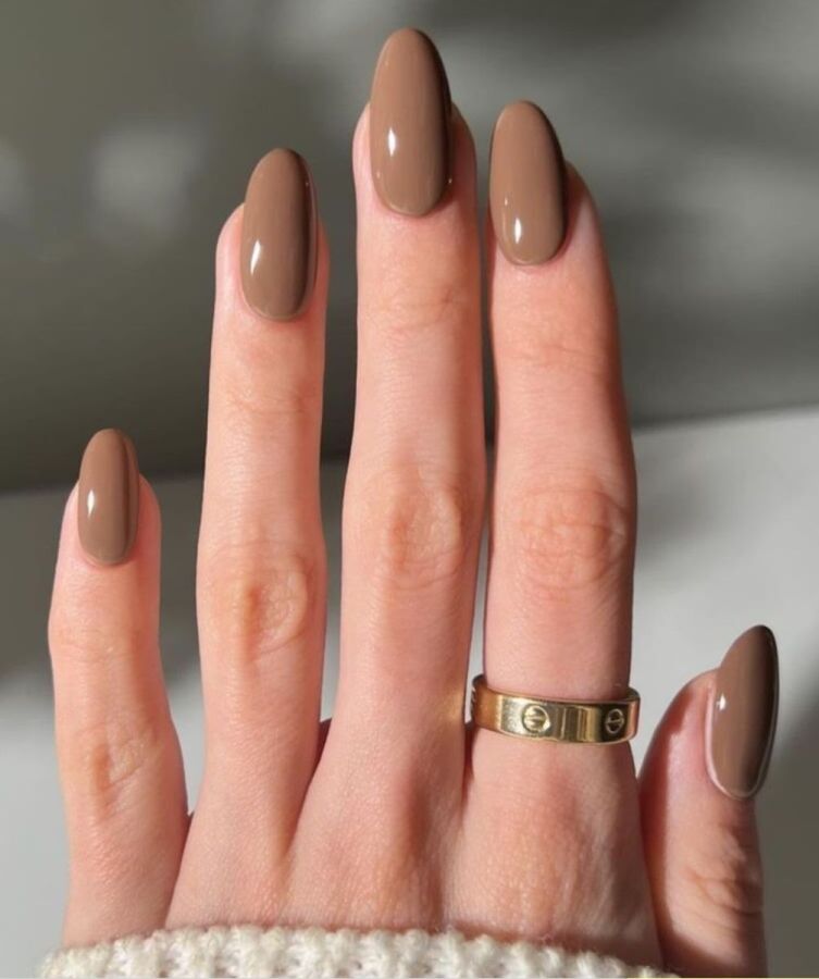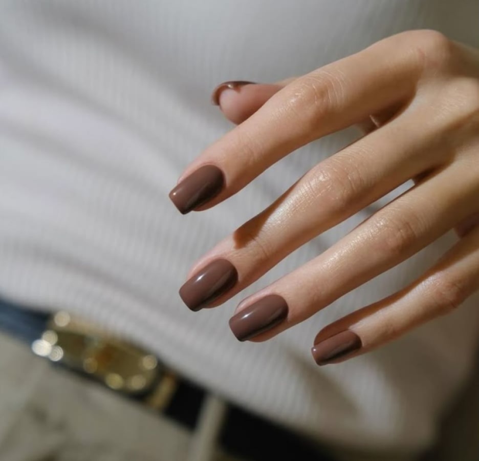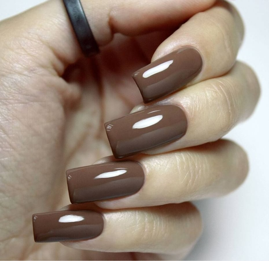 Выбирайте оттенок коричневого лака — от нежного молочного шоколада или какао до глубокого темно-коричневого — в зависимости от тона вашей кожи. Такой маникюр будет выглядеть великолепно как с глянцевым, так и с матовым топом.