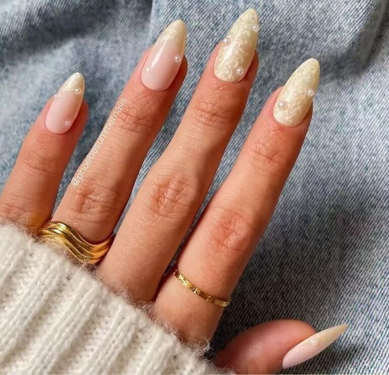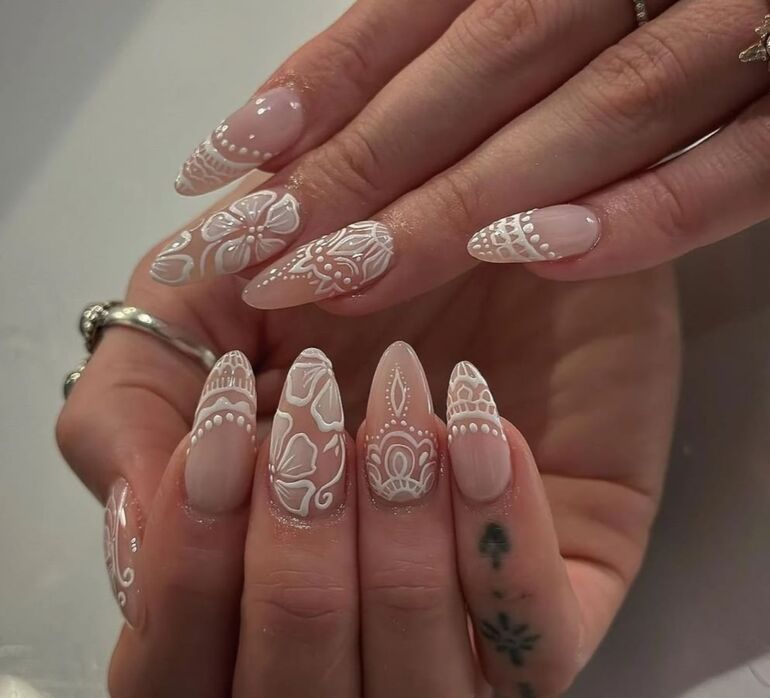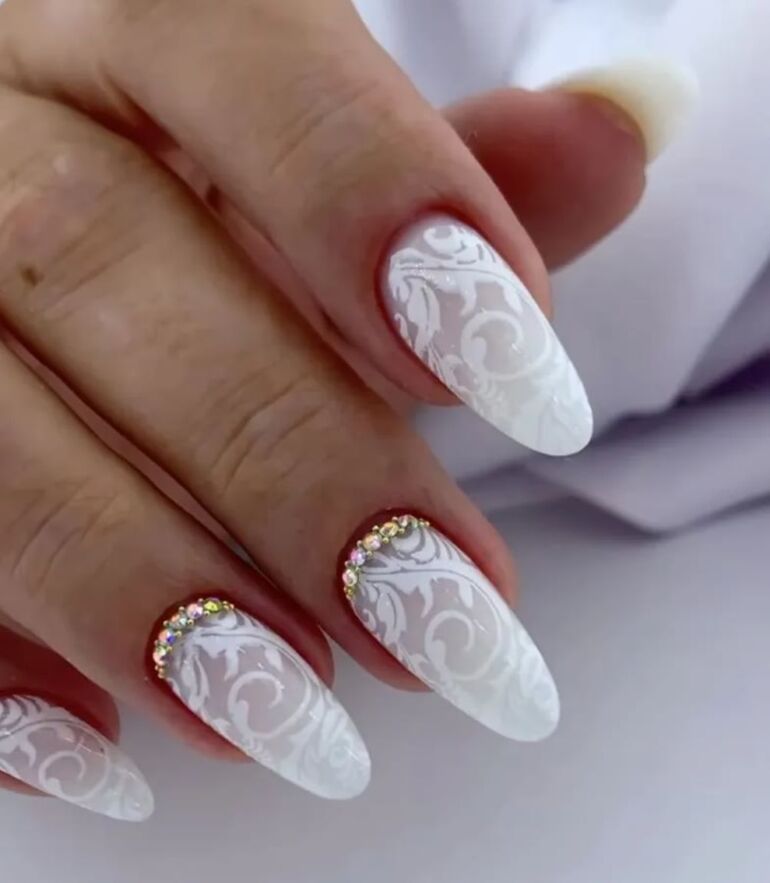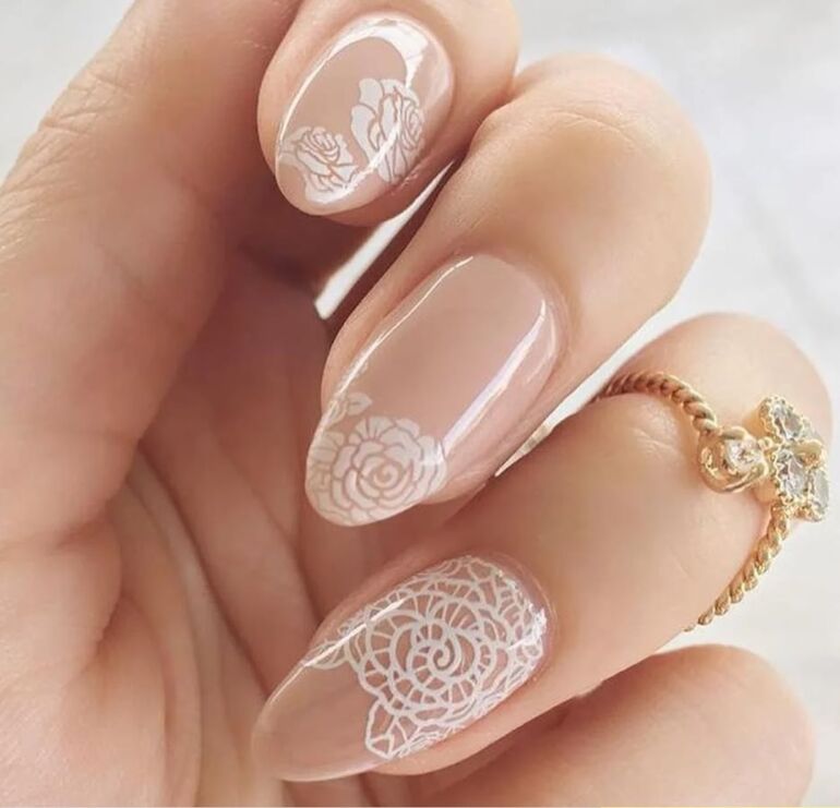 Имитация кружевного орнамента белым лаком на прозрачной или нюдовой подложке. Этот прием подчеркнет деликатность и изящество образа.