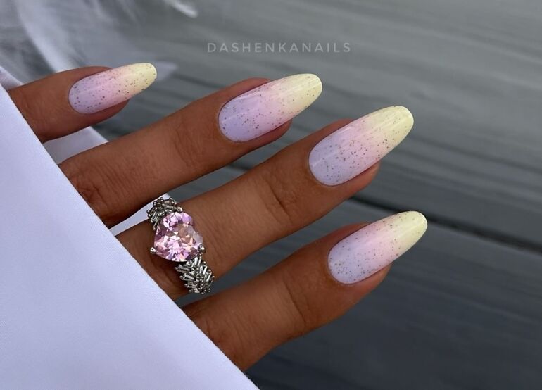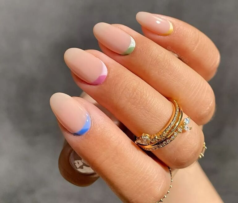 Маникюр с переходом от светло-зеленого к голубому, желтому и розовому цветам напоминает о пробуждении природы. Для завершения образа можно добавить белые точки или стразы, символизирующие капли росы.