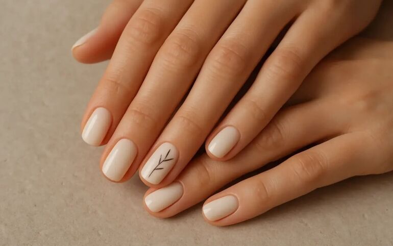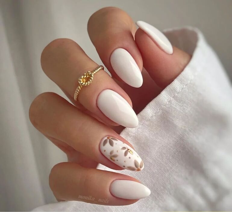 Элегантный стиль маникюра, при котором большинство ногтей окрашены в однотонный цвет, а один или два выделены декоративными элементами. Это могут быть тонкие линии, изящные рисунки или украшения контрастного оттенка. Возможен объемный декор.