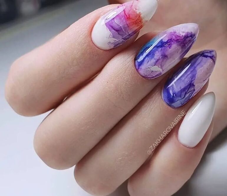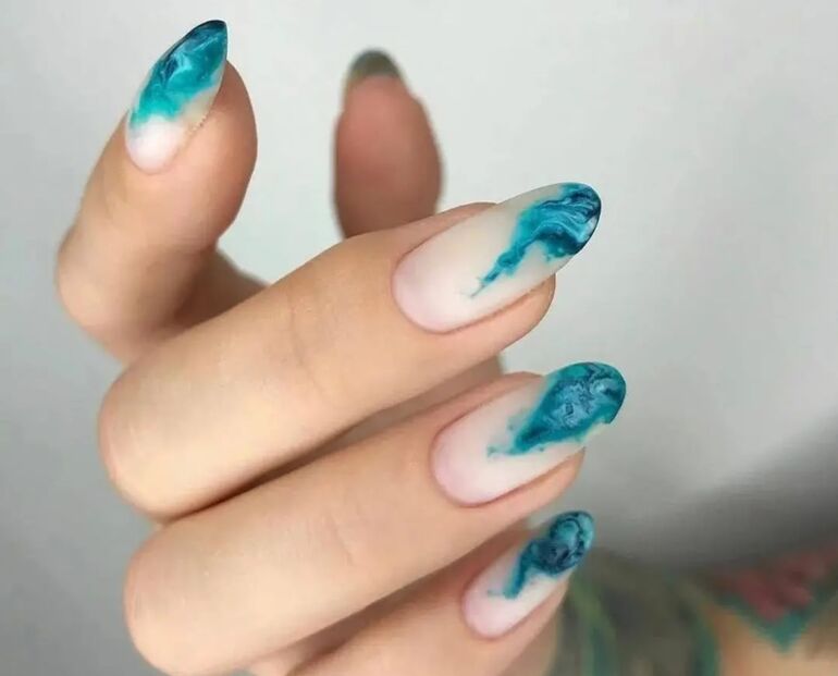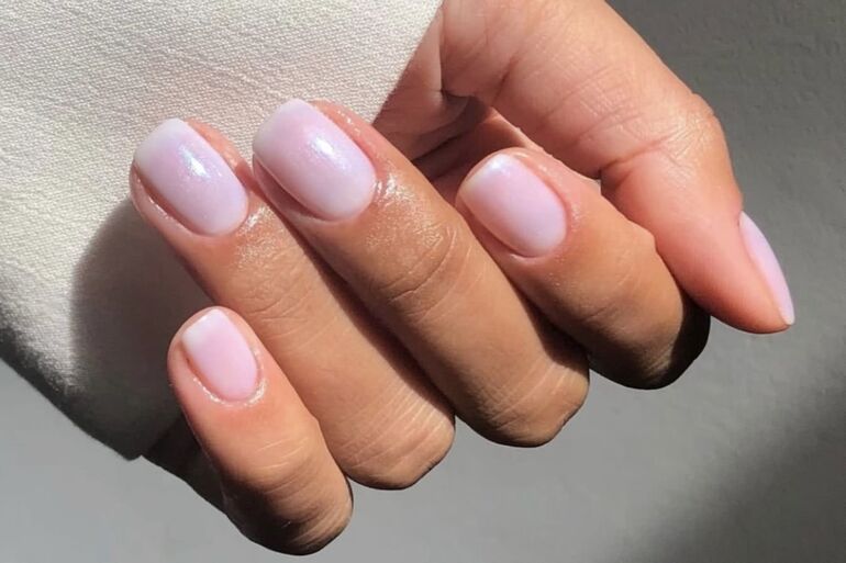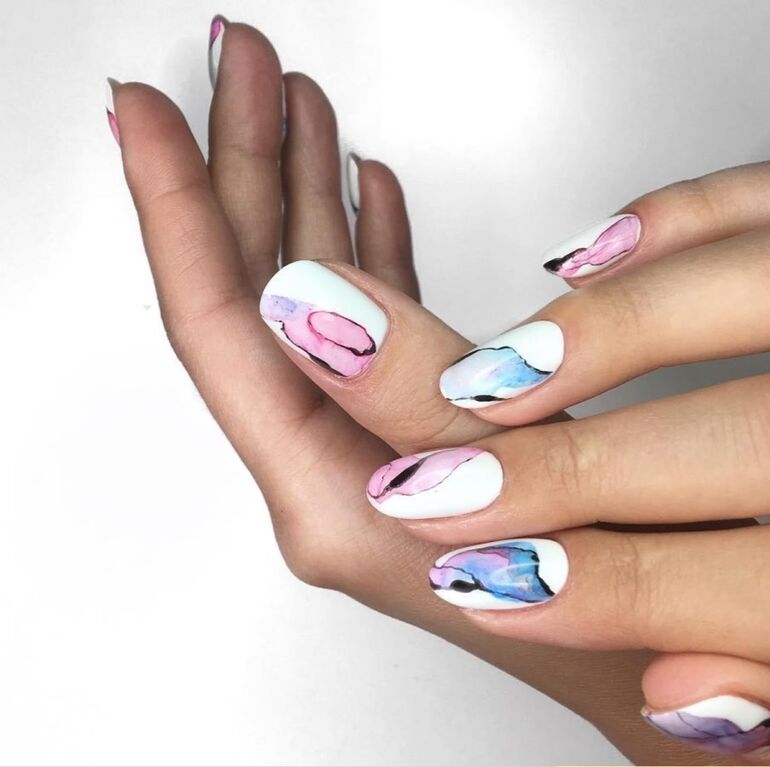 Маникюр, напоминающий акварельные мазки. Легкие, едва заметные переливы на однотонной поверхности. Глянцевый блеск добавит свежести и сияния.